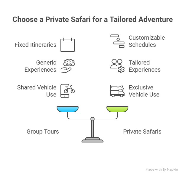 Choosing a private safari allows for complete flexibility throughout the journey. Daily activities can adjust to wildlife movements, weather conditions, and guest preferences. With a Private Custom Safari, travelers enjoy exclusive use of the vehicle, dedicated guiding, and the freedom to linger at exceptional sightings.